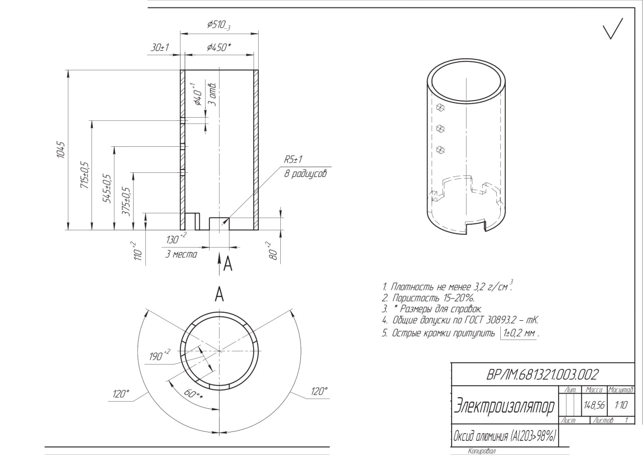 23.07.2025 Предлагаем рассмотреть возможность изготовления огнеупорных изоляторов по приложенному чертежу из оксида алюминия (Al₂O₃, с пористостью 15–20%): Электроизолятор ВРЛМ.681321.003.002 – требуется 4 шт. Рассматриваем изготовление как трубы (без отверстий и пазов, для нас даже предпочтительнее), так и изготовление по чертежу. В случае изготовления трубы, требуется подтверждение возможности обработки лезвийным методом для подгонки изолятора по месту. Потребность разовая.  |