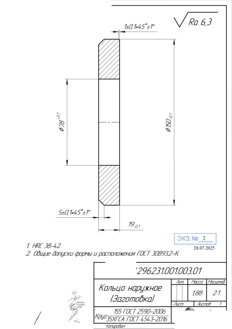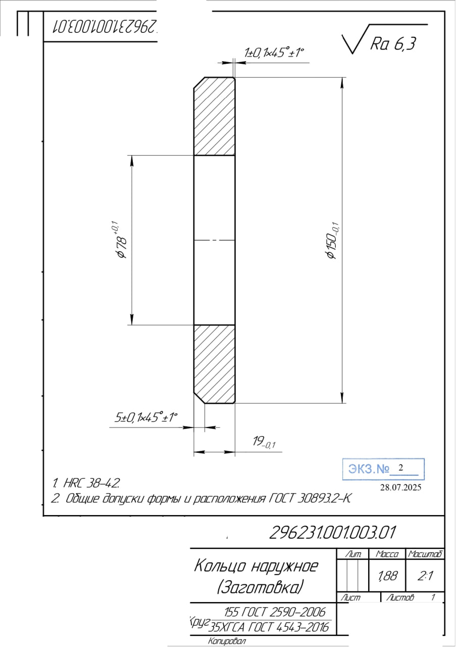 30.07.2025 Предлагаем рассмотреть возможность изготовления: Наружное кольцо 296231.001.003.01. Полный комплект КД по запросу. Обращаем ваше внимание, что замена материала 35ХГСА на другие не допускается. 50 шт. РФ. г. Санкт-Петербург  |