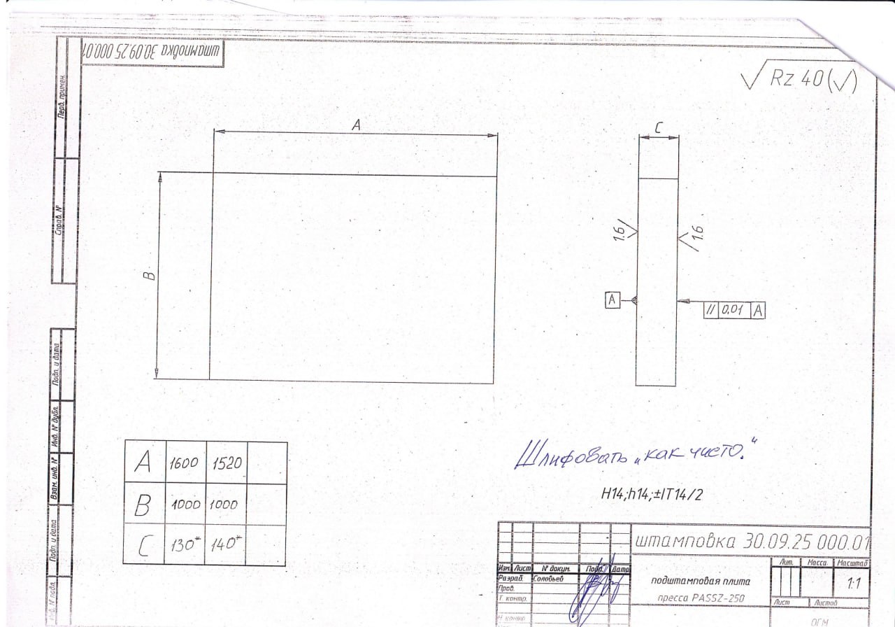 03.10.2025 Шлифование двух подштамповых плит неразборных (1000х1520 и 1000х1600) совместно с вкладышем для устранения повреждений  |