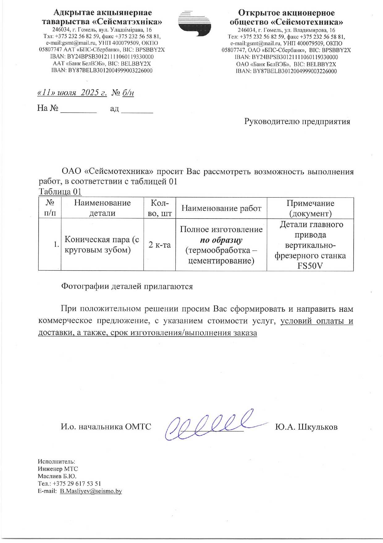 12.07.2025 Просим сообщить о технической возможности изготовления комплектующих, в соответствии с запросом во вложении и, по возможности, направить коммерческое предложение.  |